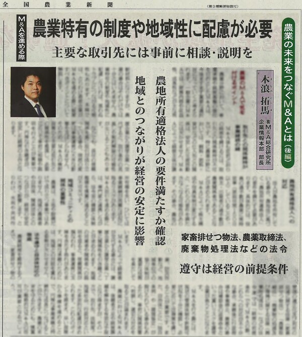 全国農業新聞様に農業のM&Aについて解説記事を掲載いただきました。